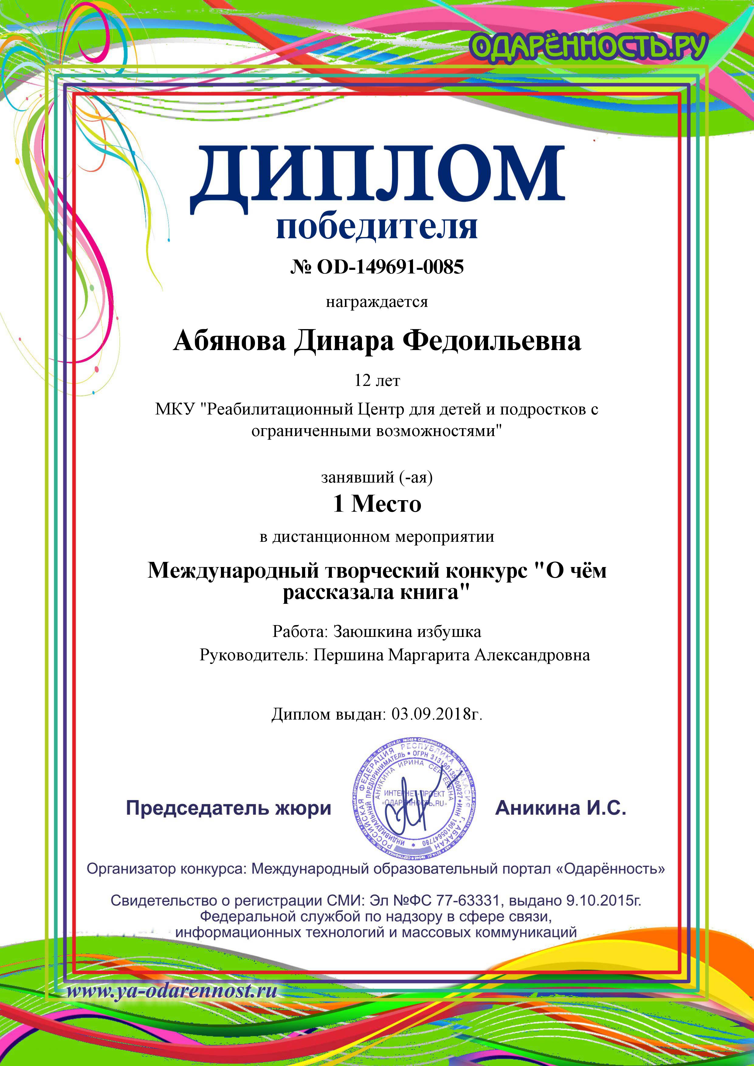 (на международном образовательном портале «Одаренность»), с работой «Заюшкина избушка».