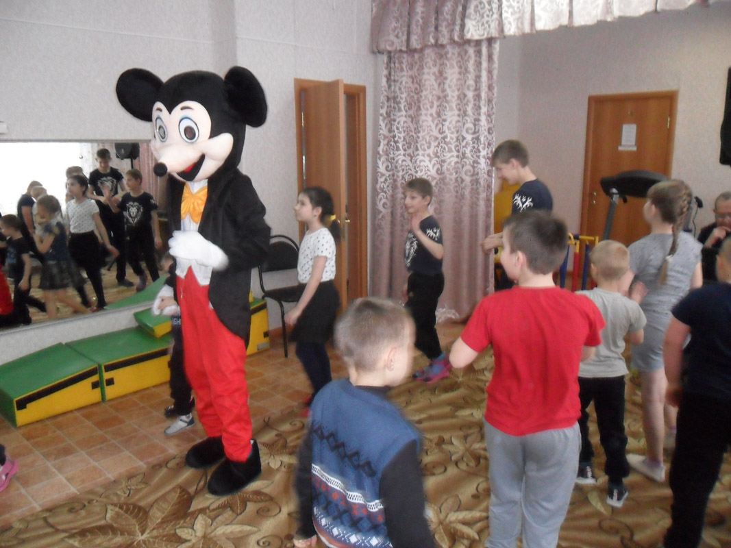 На этот раз нашим детям предстояло отправиться в путешествие по станциям: «Разминочная», «Бутербродная», «Чударики». где под музыкальное сопровождение они выполняли ритмичные движения. Добирались до станций на разных видах транспорта (ехали на машине, летели на самолёте и т.д.). В завершении программы в гости к ребятам пришёл Микки-Маус, который завлек детей в зажигательный танец.