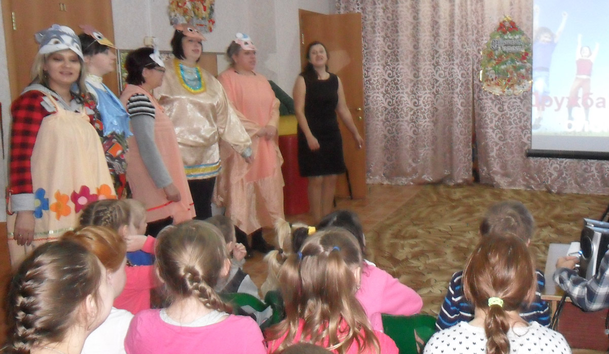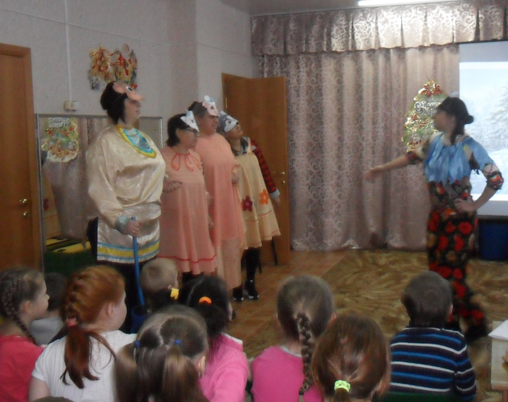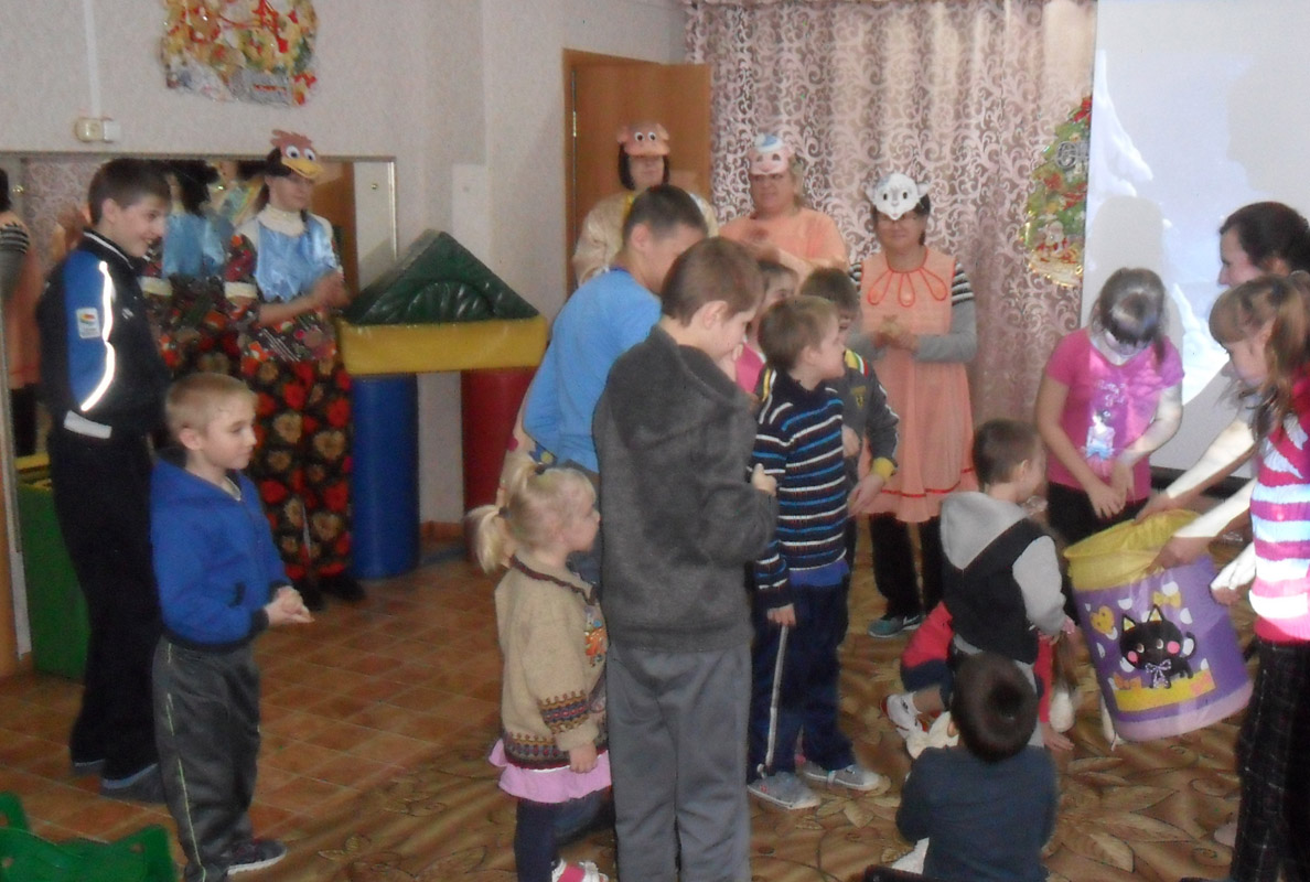 Программа мероприятия основывалась на русской народной сказке «Зимовье зверей». Педагоги встретили детей в нарядных костюмах быка, козы, свиньи, кота и петуха. Сказка рассказала о том, как звери благодаря дружной работе построили в лесу избу. Сказочные герои пригласили и детей на новоселье, развлекали их задорной игрой в снежки, танцем со снежками, загадками о зиме.