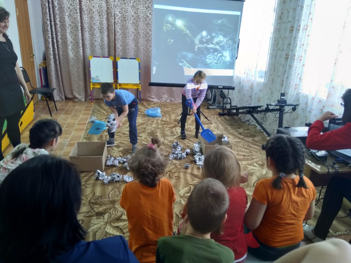Кузбасс богат природными ископаемыми. Горняки в шахте добывают уголь. Юные «шахтеры» каждый в свою смену кидал «уголь» лопатой в «вагогнетку».