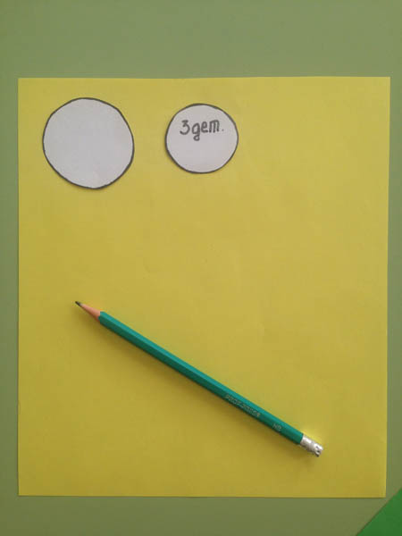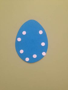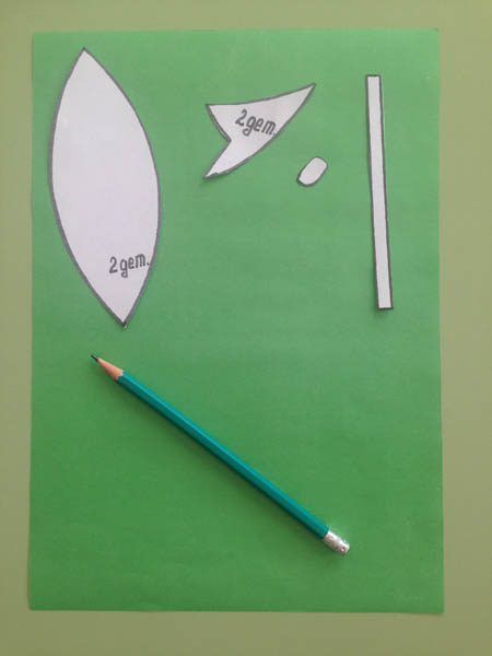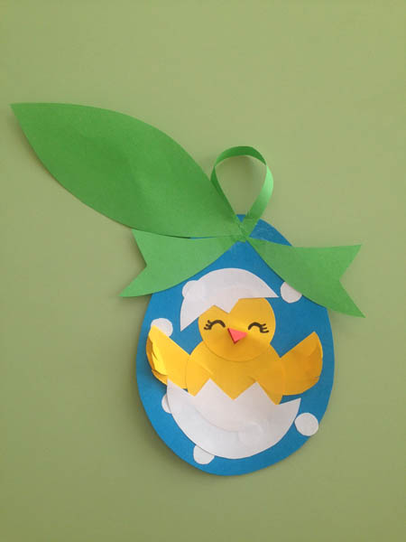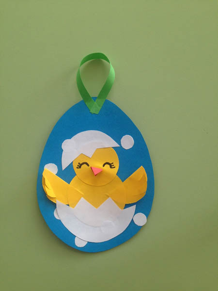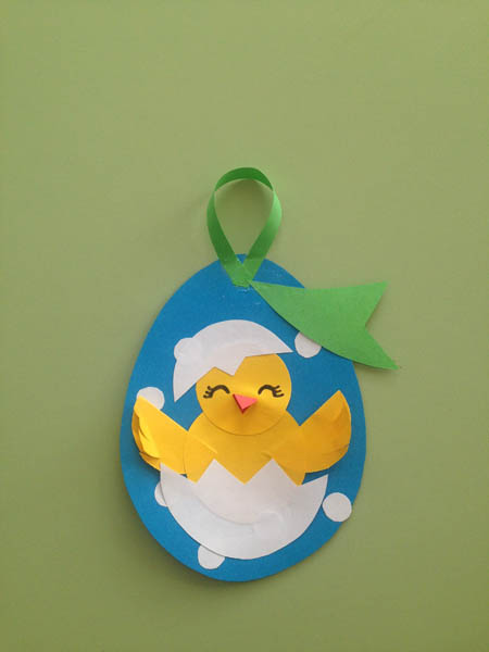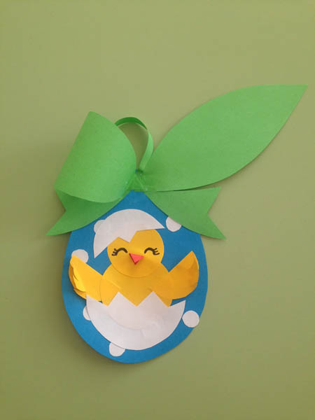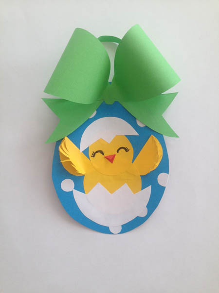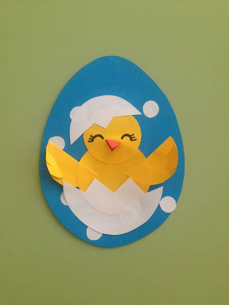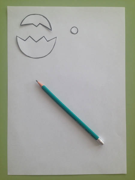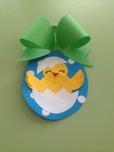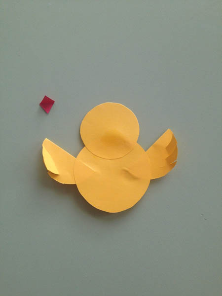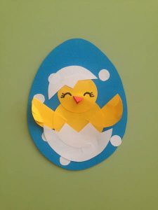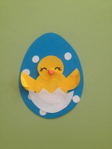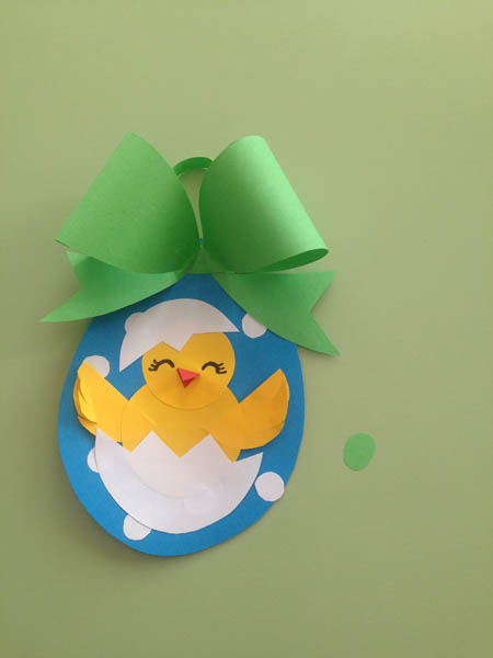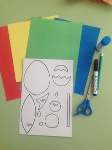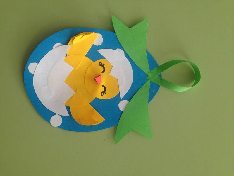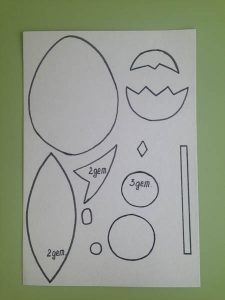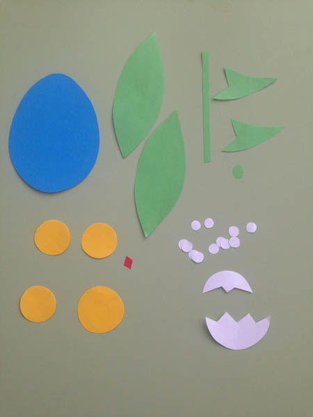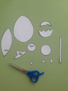 3.Из цветной бумаги с помощью шаблонов вырезаем  детали открытки:  из картона – основу открытки, из  бумаги красного цвета –клюв, из белой бумаги скорлупки и маленькие кружки для декора основы открытки, из бумаги жёлтого цвета- 1 круг диаметром 5 см ( тельце цыплёнка), 3 круга диаметром 4 см (голова и крылья цыплёнка), из бумаги зелёного цвета заготовки будущего бантика и петельки.