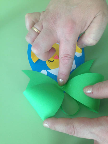 11.Берем  полоску зелёного цвета, приклеиваем одну сторону  на верхнюю часть открытки, формируем петельку, приклеиваем второй сторону  полоски.