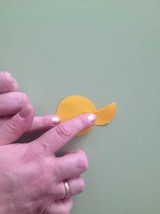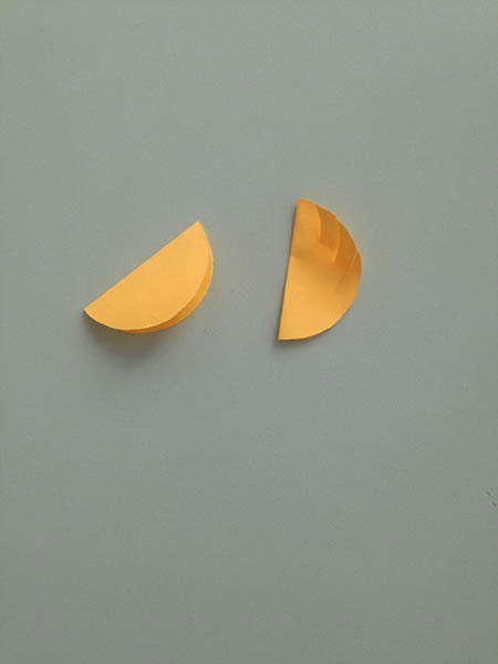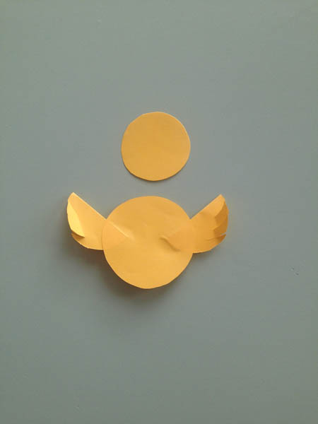 5.Берём два кружка диаметром 4 см и складываем пополам. По краям будущих крыльев  ножницами  делаем  небольшие надрезы и с помощью ножниц загните их кверху.