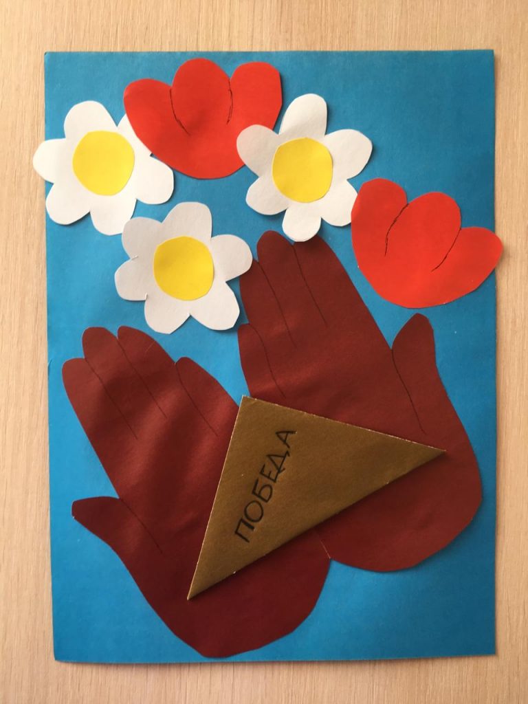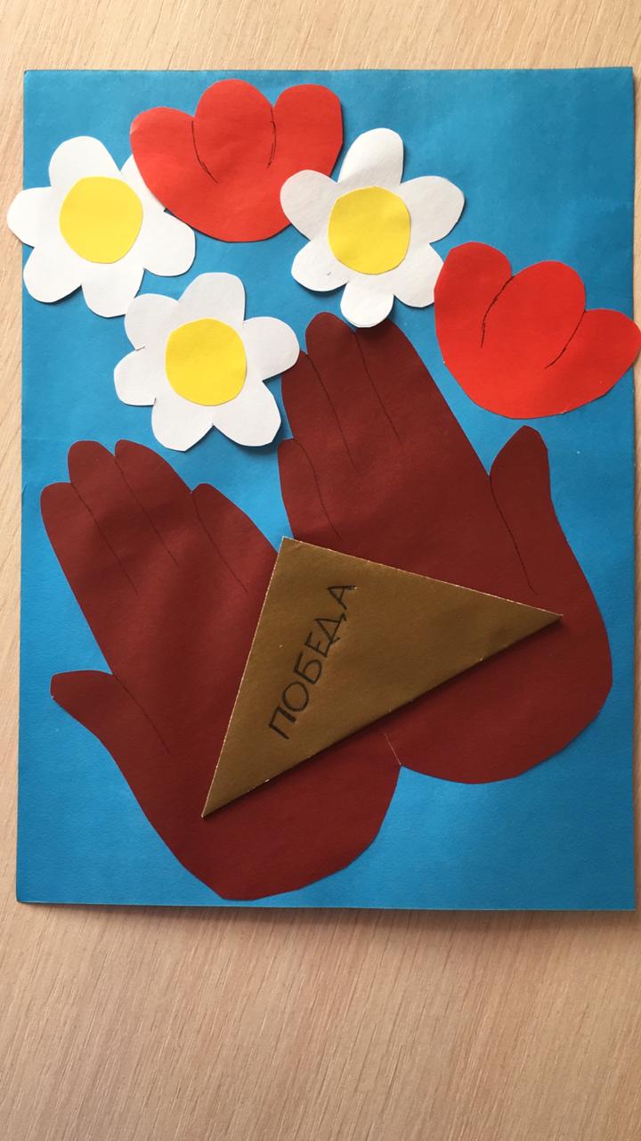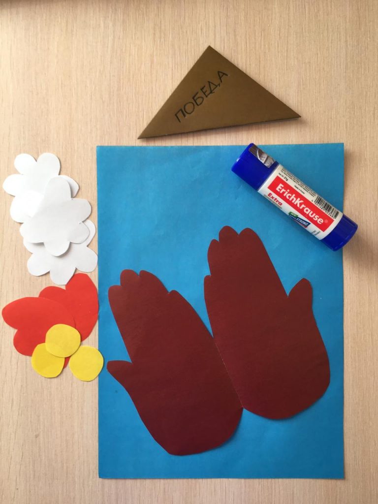 5. На картон голубого цвета ( основу ) с помощью клея приклеиваем цветные детали открытки. Сначала ладони на них конверт и вокруг цветы.
