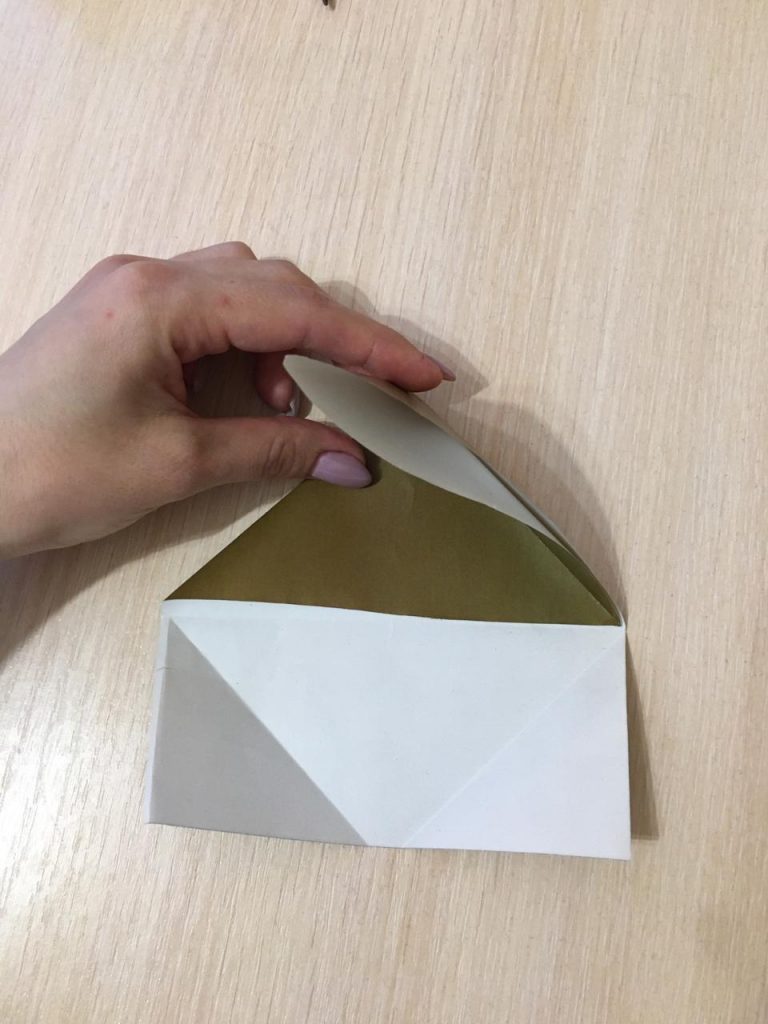 4.3. Осталась нижняя часть листа. Берём левый нижний и правый нижний углы и загибаем их к середине нижней части листа.