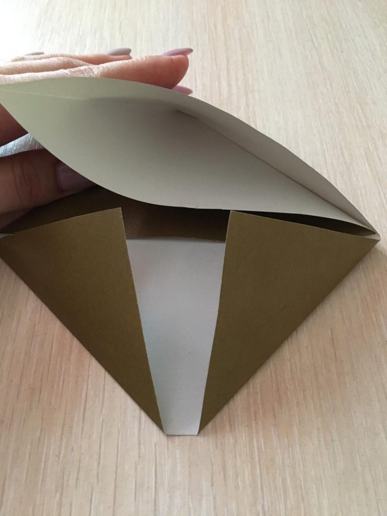 4. Из цветной бумаги золотого цвета делаем треугольный конверт. Берём лист размером 20*14 см.