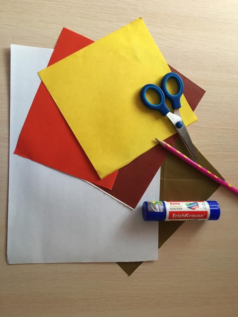 1. Для изготовления открытки нам понадобятся: картон голубого цвета,цветная бумага (красная, желтая, коричневая, золотая), альбомный лист, шаблоны, простой карандаш, клей, ножницы.