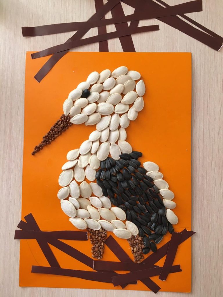 4. Крыло и глаз делаем из семян подсолнечника, а клюв и ноги из гречневой крупы
