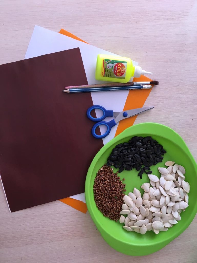 Для изготовления аппликации нам понадобятся: белый лист бумаги, цветная бумага (коричневая, оранжевая), клей ПВА, кисть, простой карандаш, ножницы, семечки подсолнечника, тыквенные семечки и гречневая крупа.