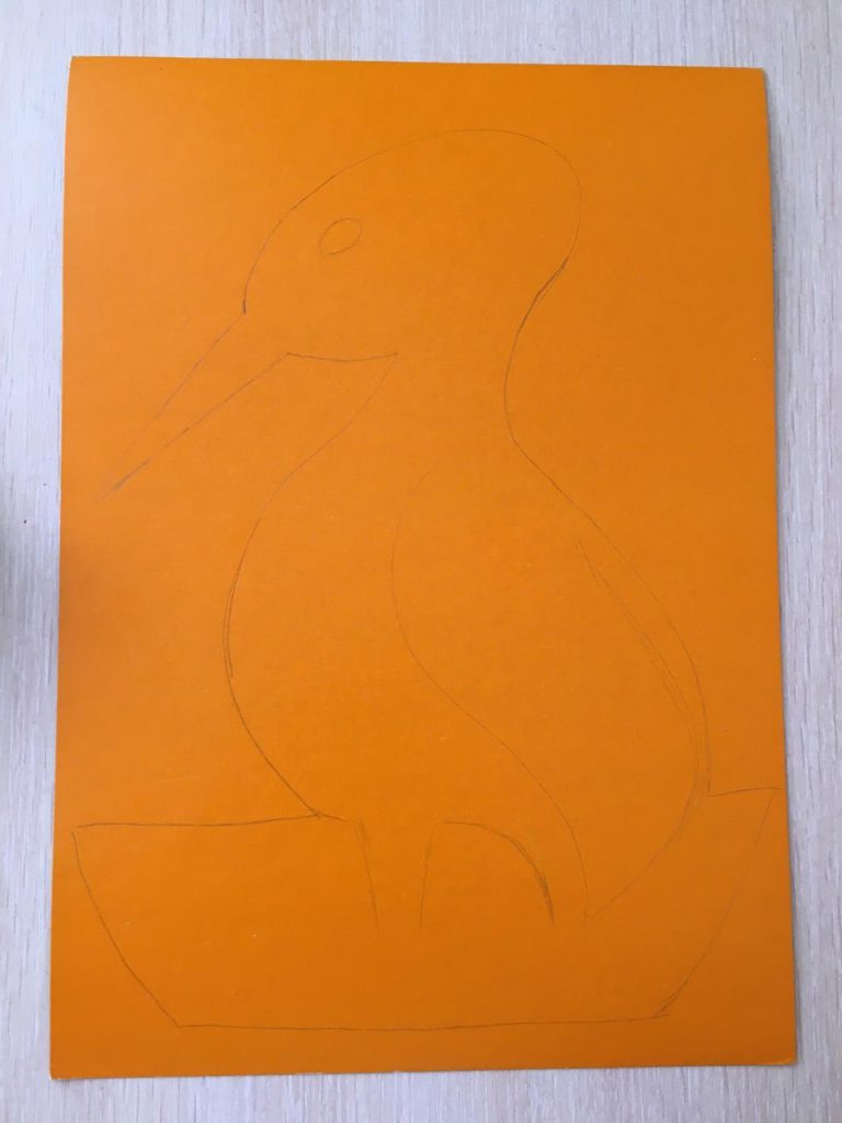 2. Берём фоновый оранжевый лист и по шаблону наносим контур птицы