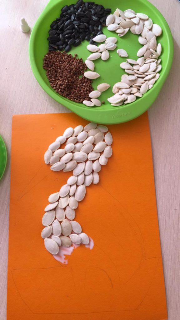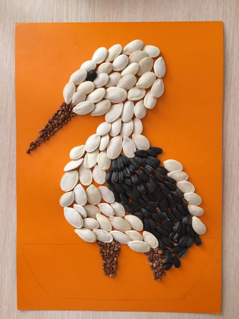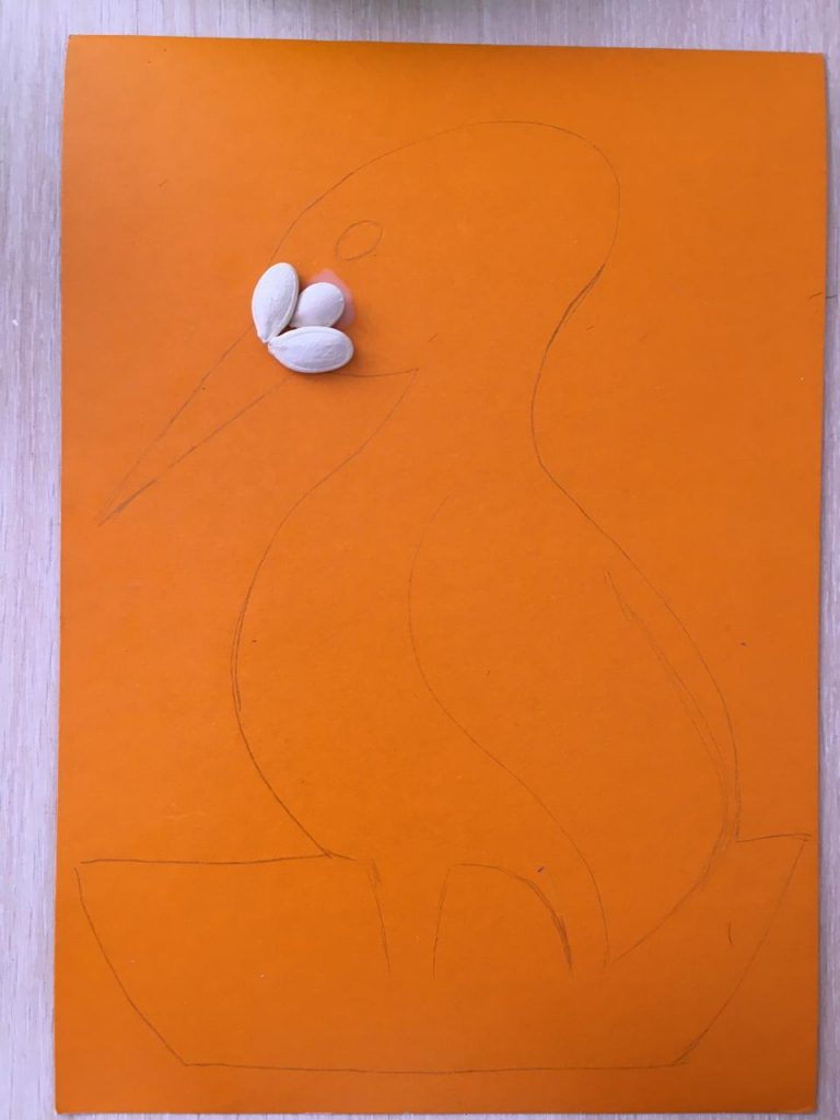 3. Наносим клей на изображение и из семян тыквы выкладываем голову и тело птицы