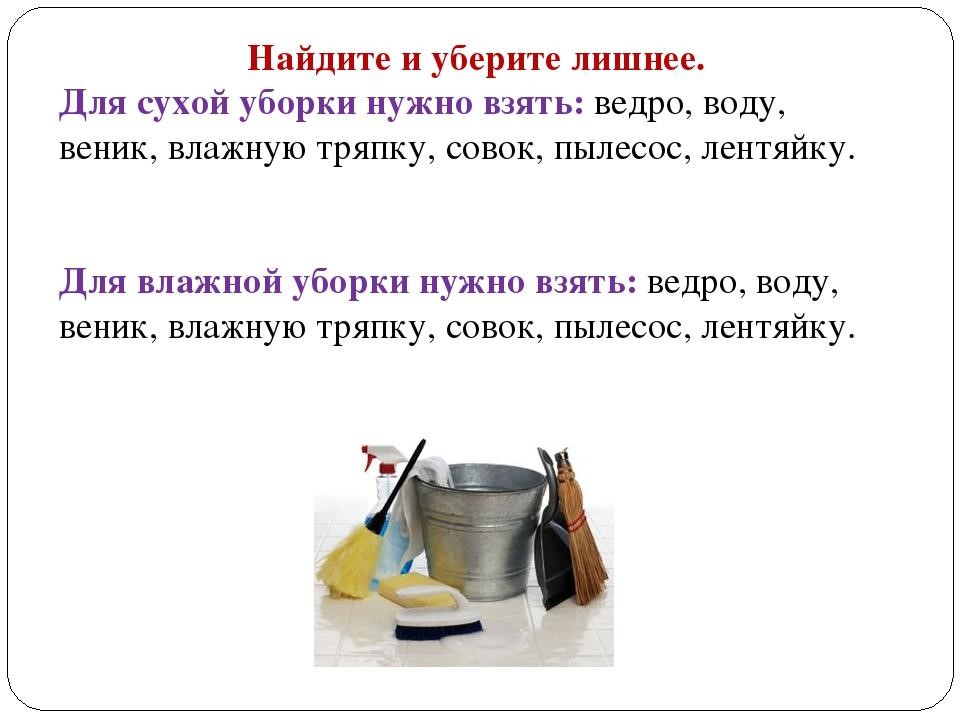 - Света приготовила для уборки комнаты ведро, совок, метлу, освежитель воздуха. Что здесь лишнее? Сухую или влажную уборку решила сделать Света?