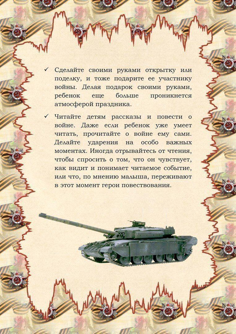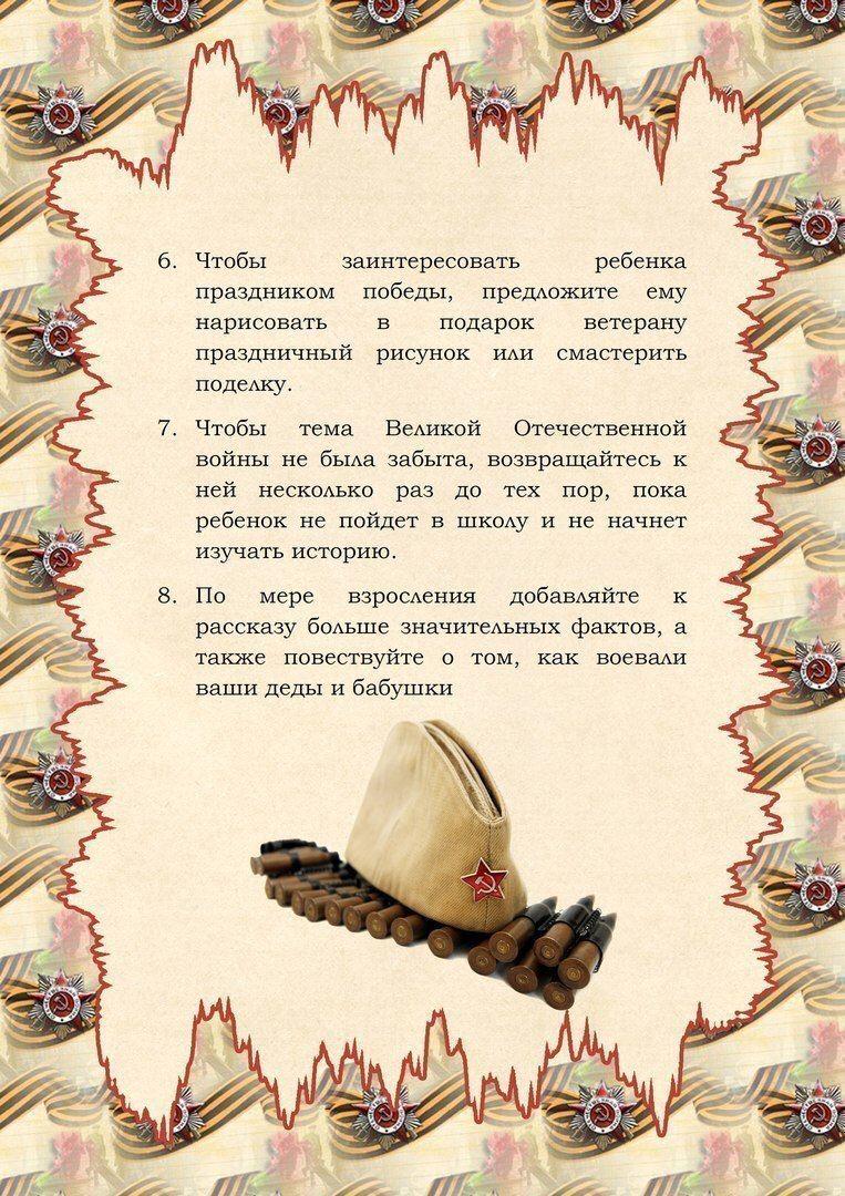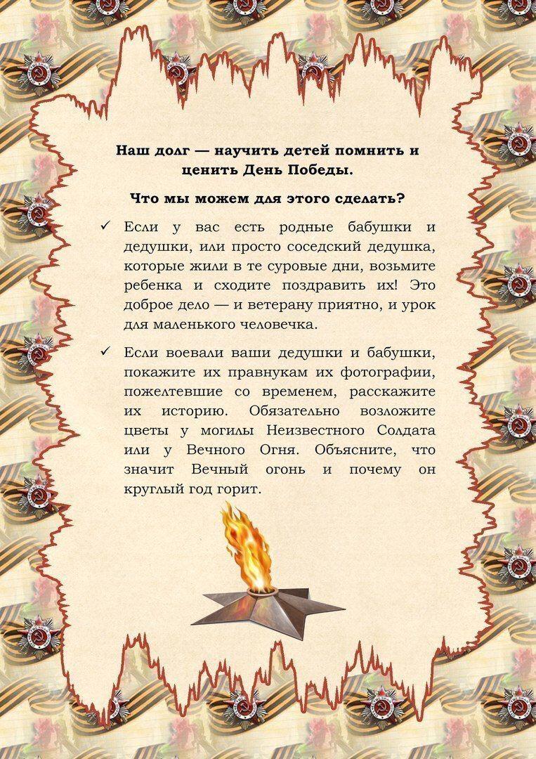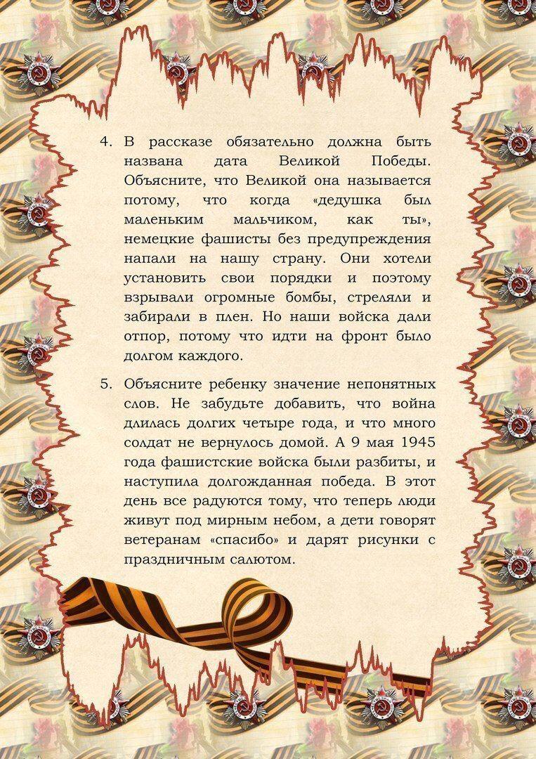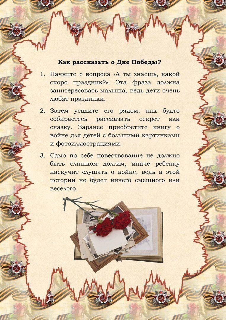 Уважаемые родители! В преддверии праздника День Победы многие дети задают вопросы об этом дне, и не все взрослые могут объяснить, что это такое на понятном детском языке. Мы предлагаем Вам в помощь шпаргалку «Как рассказать ребёнку о Дне Победы».