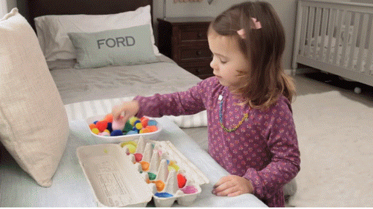 С помощью шариков и раскрашенных ячеек лотка из-под яиц вы можете учить ребенка сортировать предметы по цвету и форме, а также считать их.
