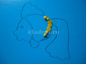 3.Работу начинаем с туловища рыбки. По контуру на фоне прикрепляем скатанные шарики и прижимаем их.