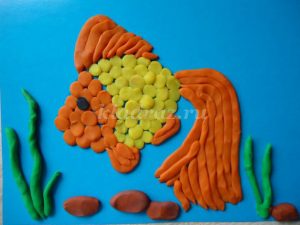 5. Голову рыбки выкладываем из оранжевого пластилина.