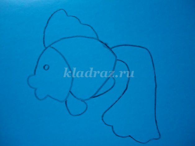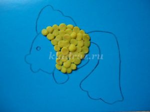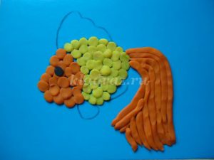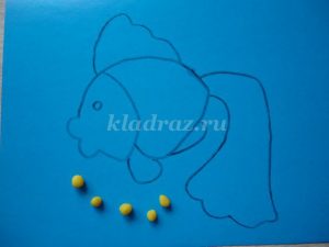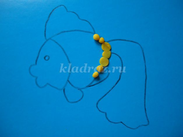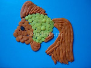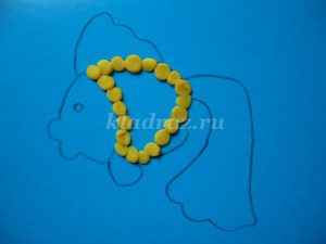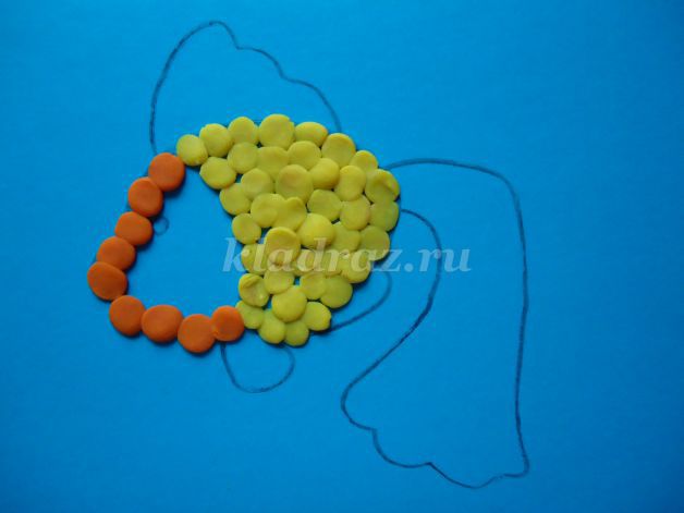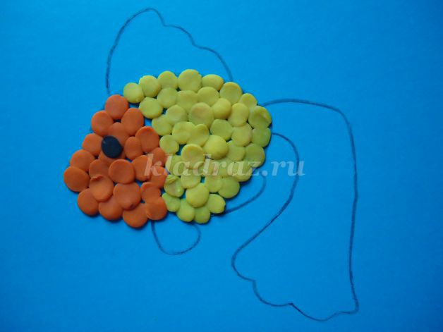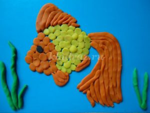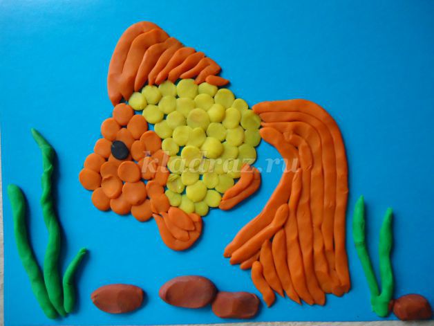 1.На картоне с помощью шаблона рисуем эскиз рыбки.2.Формируем шарики, отщипывая небольшие кусочки желтого пластилина, и катаем их круговыми движениями между большим и указательным пальцами руки.Для данной работы они должны быть небольшими, одного размера.3.Работу начинаем с туловища рыбки. По контуру на фоне прикрепляем скатанные шарики и прижимаем их.4. Заполняем все туловище рыбки. 5. Голову рыбки выкладываем из оранжевого пластилина.6. Не забываем про глаз, его делаем из черного пластилина.7. Берем оранжевый пластилин и раскатываем из него жгутики.8. Для оформления хвоста крепим жгутики по всей поверхности детали.9. Плавники оформляем также как хвост из жгутиков оранжевого цвета.10. Для изготовления водорослей берем зеленый пластилин. Раскатываем из него жгутики и придаем извилистую форму.11.Для оформления дна скатываем пластилин коричневого цвета в шарики. Прижимаем их, придаем форму диска.