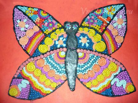К примеру эта бабочка! Несколько видов спиралек, шарики и колбаски из пластилина помогут создать настоящую красоту.