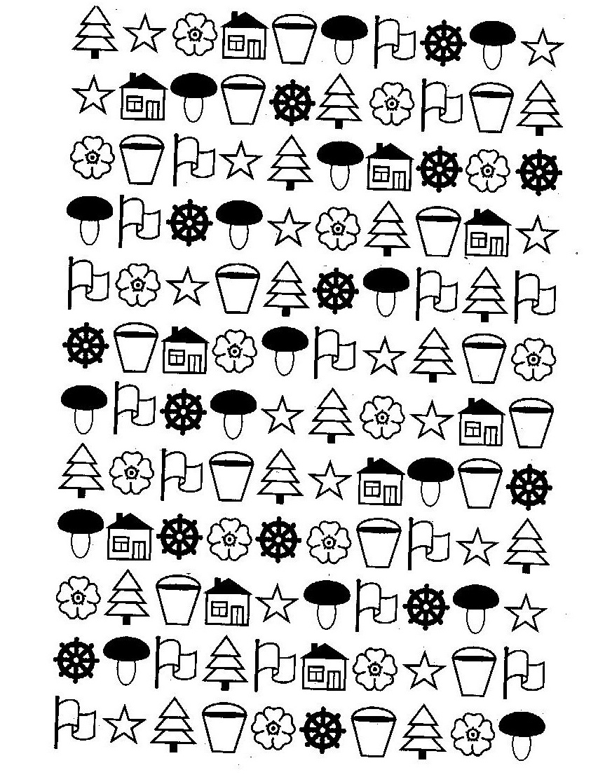 Ребенку предлагается таблица, где в несколько рядов изображены знакомые предметы или геометрические фигуры. Нужно зачеркнуть, например, все елки или все квадраты.