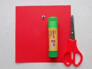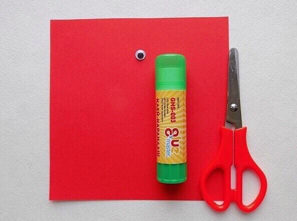 1. Для изготовления такой рыбки нам понадобятся: квадратный лист бумаги красного цвета (у нас размером 15х15 см), клей, пластмассовый глазик и ножницы.
