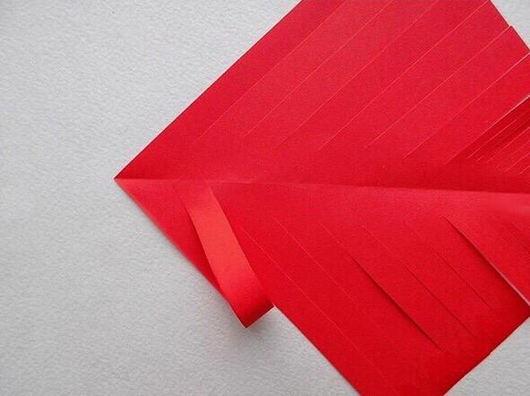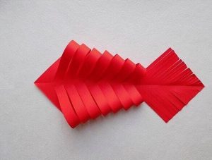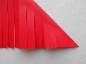 4. Делаем такие полоски шириной примерно 1 см. В нашем случае получилось сделать 7 таких полосок. На оставшейся части заготовки делаем частые надрезы (также не доходим до линии сгиба), это будет хвостовой плавник будущей рыбки.