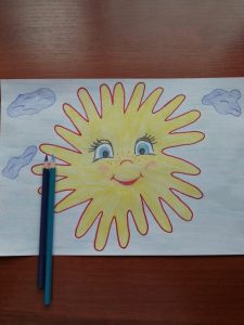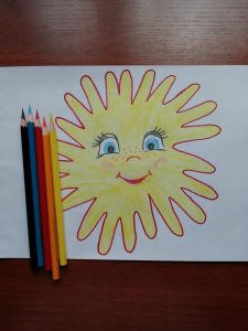 - Рисуем нашему солнышку личико, раскрашиваем цветными карандашами.