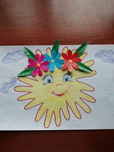 - Приклеиваем получившиеся цветы и листочки на солнышко.Рисунок готов.