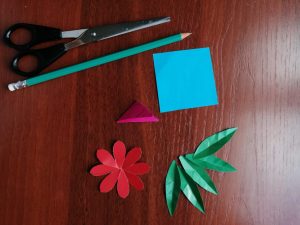- Теперь украшаем наше солнышко цветами. Для этого нам понадобится цветная бумага. Вырезаем квадраты со стороной 6 см. Квадрат цветной бумаги сворачиваем по диагонали три раза, (получился треугольник), рисуем лепесток и вырезаем. Разворачиваем получившийся цветок. Количество цветов произвольное, зависит от размера вырезаемых цветов. Кончики цветов можно завить ножницами. Таким же образом вырезаем листочки.