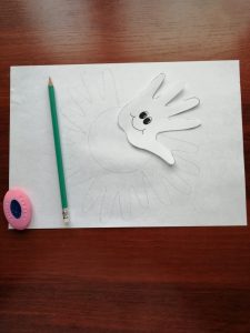 - Рисуем круг. Обводим пальчики рук по кругу, чтобы получилось солнышко (в моем варианте использован шаблон детской ладошки).