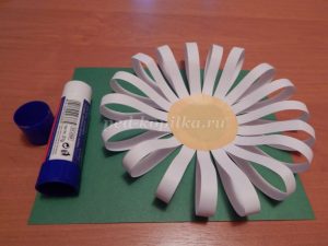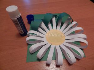 Собираем аппликацию. На зеленый картон приклеиваем ромашку.