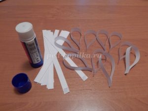 Получившиеся полоски сворачиваем пополам и кончики склеиваем. При сворачивании сгиб не проглаживаем, чтобы он остался объемным.