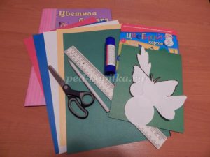 Бумага белого, желтого и зеленого цвета для ромашки, цветная бумага для бабочки, зеленый картон, простой карандаш, линейка, ножницы, шаблоны, клей, образец работы.