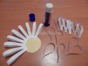 Берем серединку (желтый кружок) и по кругу приклеиваем лепестки.