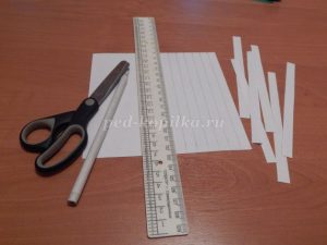 Половину листа белой бумаги с помощью линейки расчерчиваем (по 1 см) и разрезаем.