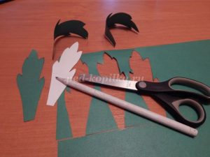 Из зеленой бумаги по шаблону вырезаем 3 листика и осторожно проглаживаем их карандашом, чтобы они закрутились.