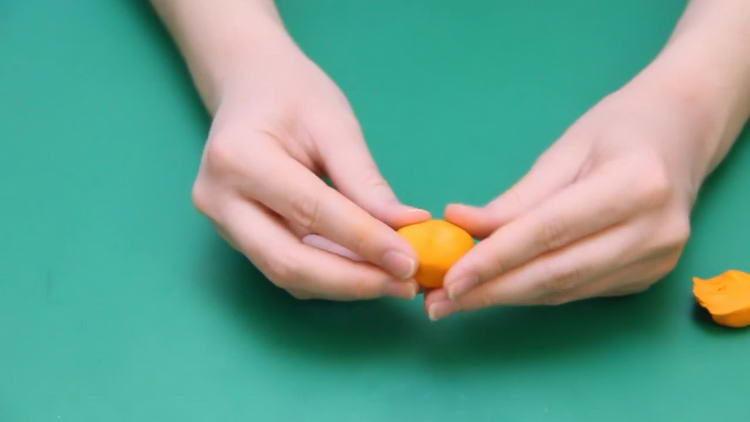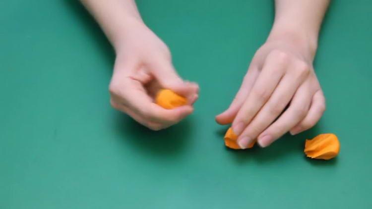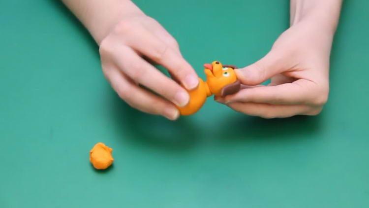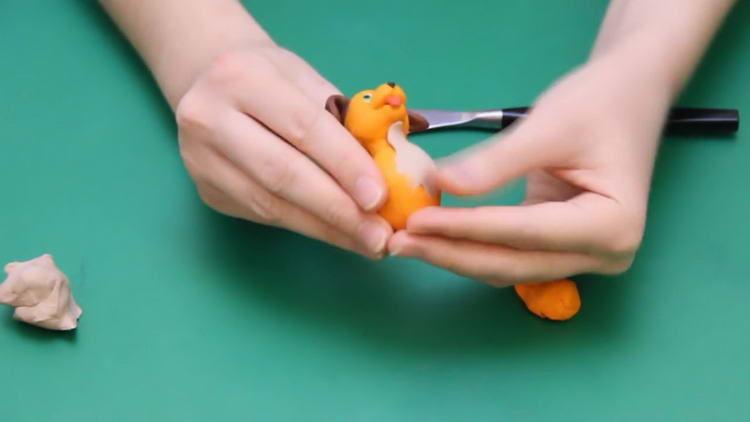 14.Для задних ножек скатаем два оранжевых шарика и придадим им форму таблетки. Лапки сделаем вытянутыми и прикрепим их к верхней части ножек. Обе лапки притрем к туловищу с боков.
