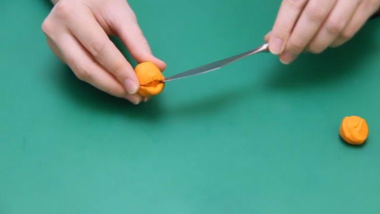 4. Приминаем место для глазок и носика. Стекой разрезаем место под ротик, слегка нажимаем. Чтобы пасть у собачки приоткрылась, достаточно легкого нажатия.