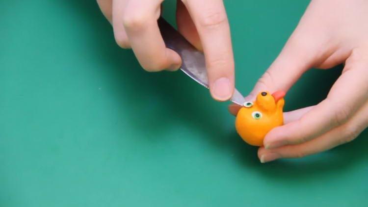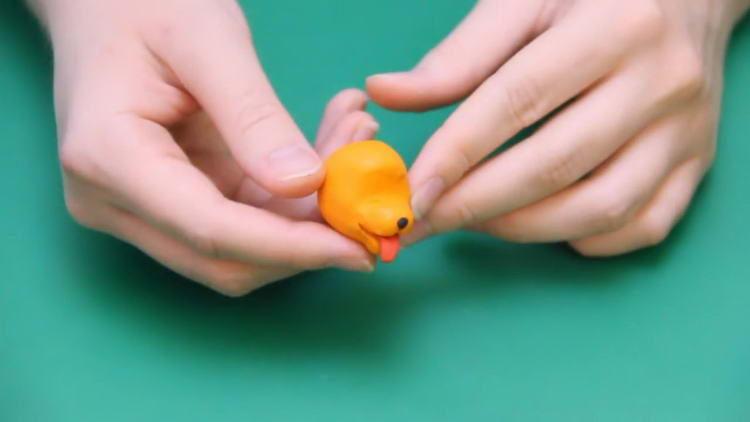 6.Из маленького кусочка красного пластилина вылепливаем плоский язычок и подставляем в приоткрытую пасть.