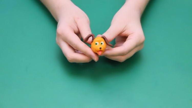 15.Хвостик будет коричневым: скатаем небольшую колбаску, приплюснем и приклеим тонкой стороной к туловищу. Наша собака из пластилина готова.