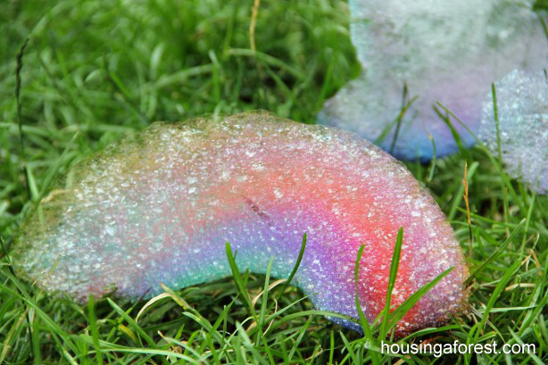 Отрежьте дно у пластиковой бутылки, натяните на неё носок, закрепите носок липкой лентой. В отдельной ёмкости смешайте жидкость для мытья посуды с небольшим количеством воды, добавьте краситель. Обмакните носок на бутылке в мыльный раствор и медленно подуйте в горлышко. У вас получится большая пенная змея. Если проявить фантазию, можно сделать радугу из пены.