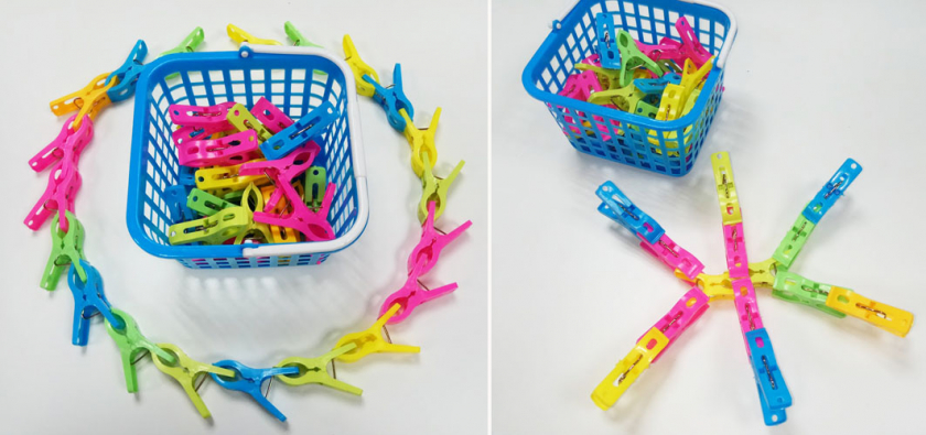 - Можно играть с ними, как с конструктором. Если прищепок много, все они яркие, разноцветные, хорошо крепятся друг к другу, ребенку будет интересно мастерить из них человечков, гирлянды, домики и многое другое.