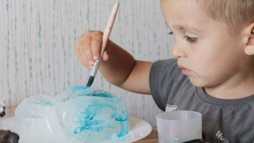 На льду также можно рисовать красками. Заморозьте воду, достаньте ее и положите в глубокую миску, чтобы стекающая жидкость не выливалась через бортики. Возьмите кисти и краски и покажите малышу, как можно сделать разноцветный лед.