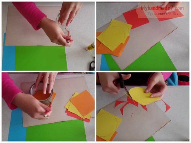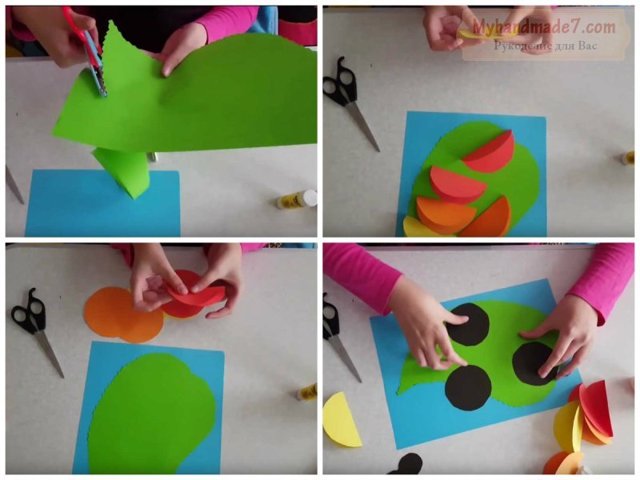 Как показано на фото, необходимо приклеить головку — полукруг с глазками. Заранее рассчитайте место на картонном зеленом листе, чтобы поместились главные детали бумажной поделки. В последнюю очередь осталось только приклеить красные крылышки, их приклеивают только одной половинкой, а вторая остается загнутой, поэтому поделка получается объемной. Можно придумать и другие варианты аппликации из цветной бумаги для детей, это могут быть и обычные божьи коровки без объемных крылышек и целые композиции. А кроме бумажных листов можно использовать и другие материалы, например, оформить картинку с помощью салфеток.
