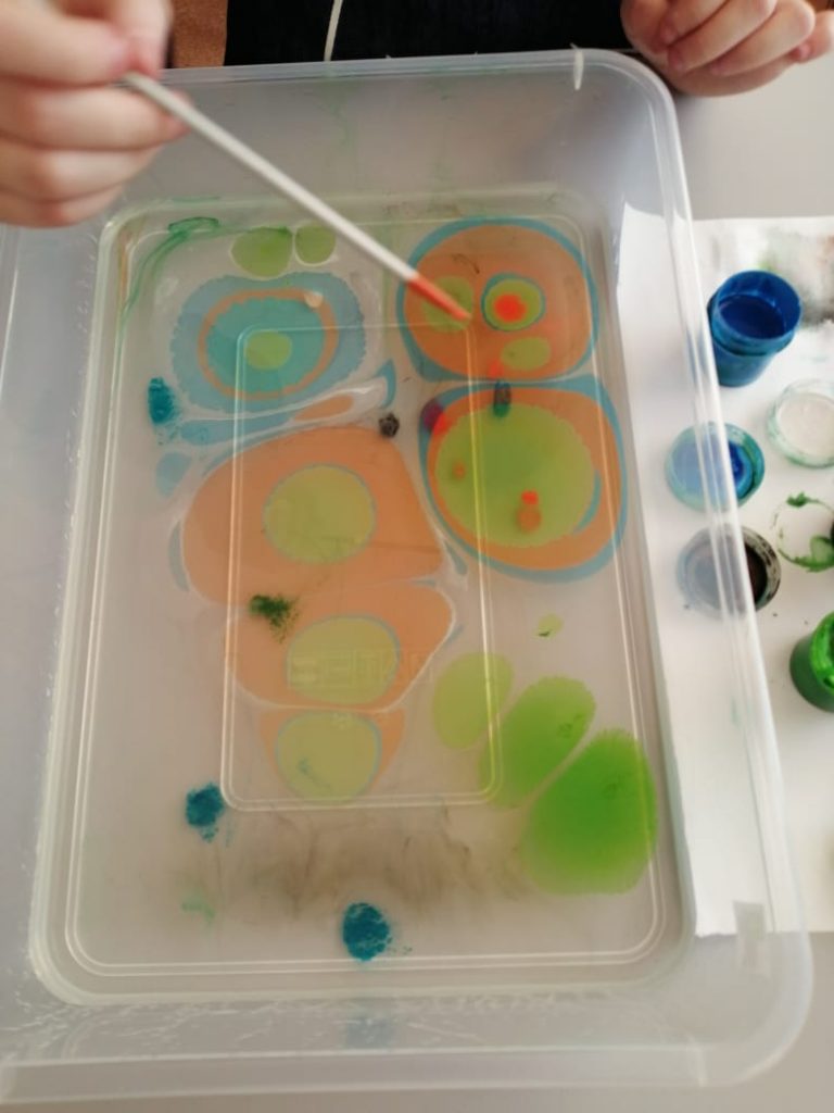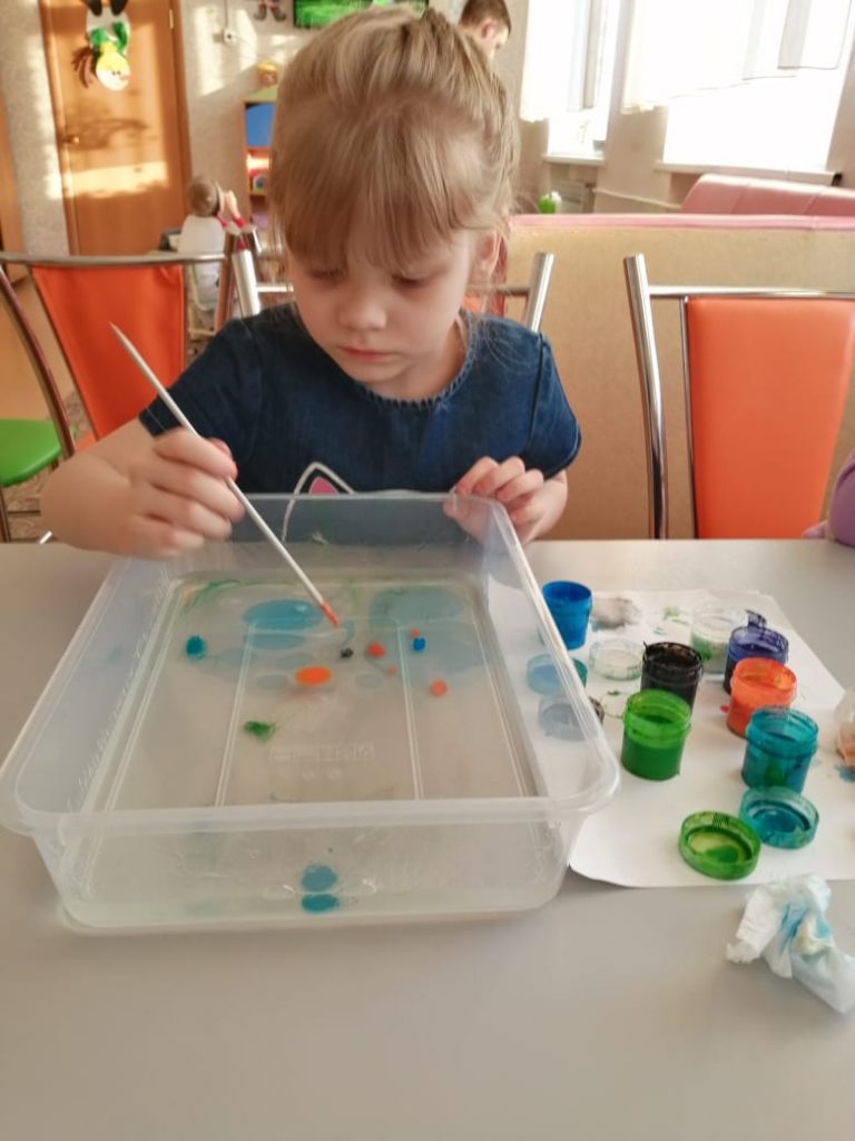 Рисование на воде – очень увлекательное и совершенно несложное занятие, которое отлично развивает фантазию и чувство цвета. Для того чтобы получить необычную и красочную картину не нужно обладать специальными навыками или способностями. Ребенок просто берет в руки кисть и начинает творить, опираясь на эмоции и интуицию. Во время смешивания красок получаются непредсказуемые орнаменты и рисунки, которые скорее напоминают узоры на природных минералах либо оперение экзотических птиц, чем результат творчества. Краски перемешиваются, принимают причудливые формы и становятся пейзажем, абстракцией или даже портретом, затем все это переносится на бумажный холст.