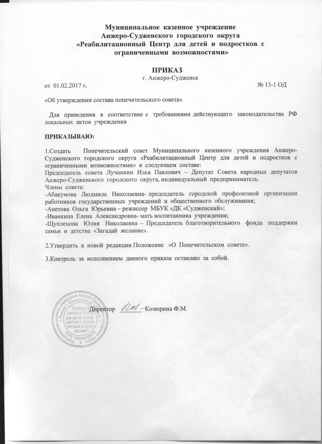 Приказ от 01.02.2017 г. “Об утверждении положения и состава попечительского совета”