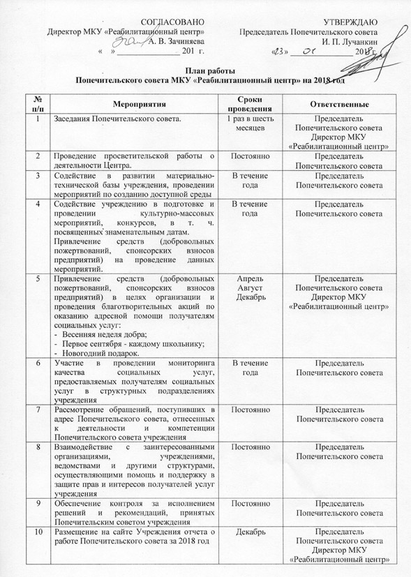 - План работы попечительского совета МКУ Реабилитационный центр на 2018 г.